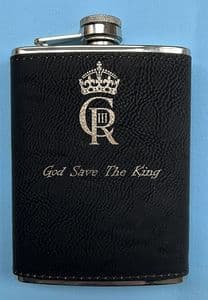 The hip flask is covered in PU leather that is lasered with the design of the new KINGS CYPHER in gold - have your name added to below the wording GOD SAVE THE KING